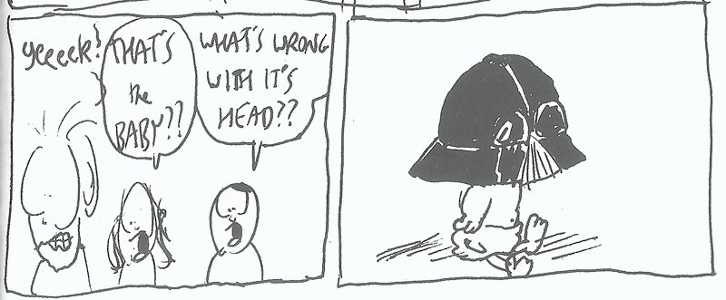 A few months earlier, I drew up a different issue, a 48-page special that was supposed to be about The Boxcar Children wandering through other contemporary media IPs. The first story was "Star Wars Episode One," and was intentionally inaccurate as an adaption (the actual thing woud not be released for a few more months yet). It was Darth Vader as a literal baby, running around Tatooine with a lightsaber and terrorizing everybody. The helmet was on him already and twice the size of the rest of his body. The Alden children played a role here (mostly Benny as a replacement Obi-Wan) but their involvement in the satire was minimal. In the next story they would be totally absent.