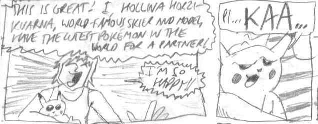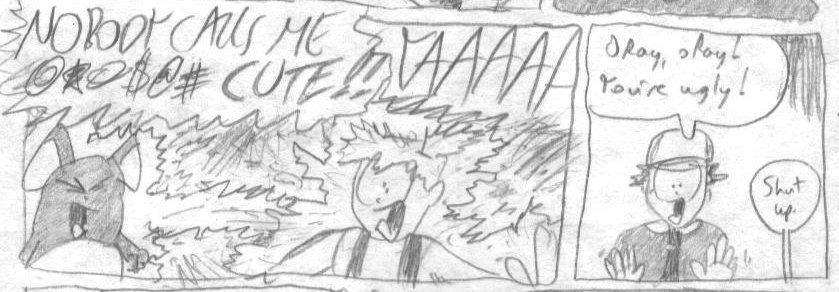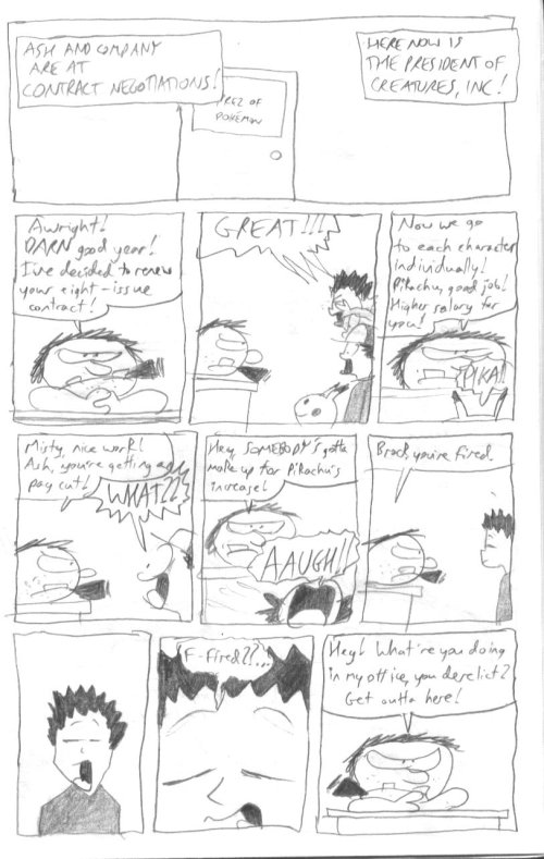 My ltttle cousin, who was also into Pokemon, received this entire story for his birthday as a homemade greeting card. Since I didn't have my scanner set up yet, I had to redraw the entire thing...but everything you see was in there. My aunt decided to curl up with him and read the comic aloud, and all was well up until the point she read the words "Artificial Insemination"...and then looked up at me with the DIRTIEST glare. Ahaha, whoops!