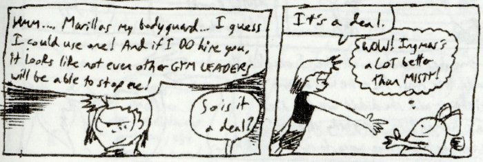 Back when I first attempted to draw these characters, I tried emulating the anime / Sugimori style, but found it was too difficult. But by the end, my art lessons had advanced to the point where I could pull the style off. Brock complains about sports teams being named after Pokemon when they have nothing to do with Pokemon, which is a direct criticism of a Johto episode where they meet a girl obsessed with a baseball team called the "Electabuzz." Now that I think about it, though, aren't a lot of sports teams in the real world named after animals? They'd be named after Pokemon too if they existed. It DOES make sense. Shut up, Brock.