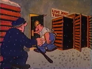 As Ziggy drags his kettle-loaded sled through the city, a stray cat hops on for the ride, which the dog doesn't like either. Ziggy runs into a meat market selling "Live X-Mas Turkeys" that look absolutely miserable. They're fully aware of their oven-bound fates and are shaking with nervousness as the Russian butcher asks Ziggy which turkey he'd like to purchase. "VWHAT? You vhwant ALL da turkeys?" he says in astonishment after Ziggy says...nothing, because Ziggy has the same telepathic communication with others that Link does. Ziggy gives the butcher $175, his asking price, right from the kettle, and then lets all the turkeys free. They squawk and gobble and fling feathers everywhere as they rush in all directions down the street. "Hoboy, you meet a lot ov KRAZY people in this turkey business," the butcher sighs.