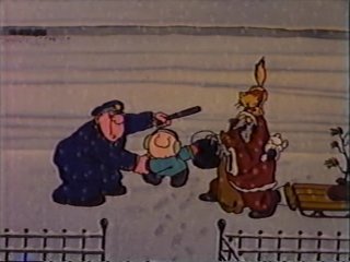 The children believe the stringy purple thief is Santa Claus, and start swarming him for the "presents" in his bag. The thief swallows hard -- he can't do this anymore. He starts handing out his purloined property to the orphans, and even has a gift for the officer....his own police badge. He gave that one rather nervously. Ziggy brought his own present...the stray cat. The kids love the cat and it seems to feel at home already, so...why not?