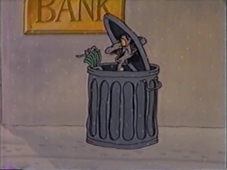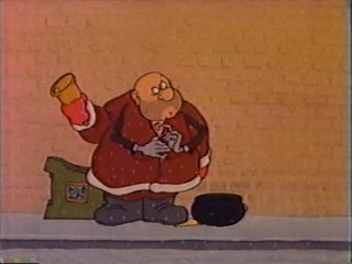I have to admit....I've never understood the whole deal about cartoon policemen sounding like leprechauns. Where did that come from? Why should a cop be expected to have an Irish accent if the setting is clearly America? Brogueish Policeman #4,353,467,923,458 is on the case of the bogus Santas, many of which are getting busted as accomplices despite being clueless to the whole scheme. This isn't good for Ziggy, who he's increasingly suspicious of. Fortunately, in Ziggy's case, the money never really gets to the criminal mastermind....Ziggy keeps seeing things that he has to give money toward, and eliminates the middleman by giving them cash from the pot directly. There is one pointless moment when Ziggy meets another Santa and takes money from his pot to put into that guy's pot. You're missing the point, Ziggy.