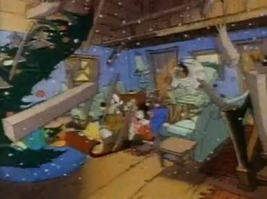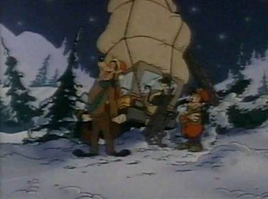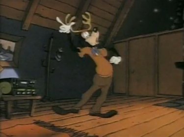 "It's....gettin' kinda....stuffy in here......think I'll go get some fresh air...." Goofy says quietly. He pulls on his Santa hat, pulls on the cat (which he thinks is his coat) and exists sorrowfully. Pete is instantly cheered up now that Goofy's outta there. "What say we all open our presents, HMM?" Pistol got a horned barbarian hat. "Woooo, I'm Conan's girlfriend!" she shouts. I think O'Brien has a little classier taste than that. Max opens his present, the one Goofy rescued, and....it's a photo of him with his dad. It's too much for him to take. He has to head out into the snow after him. And so does everybody else -- especially Pete, or there'll be no lovin' from Peg.
