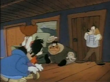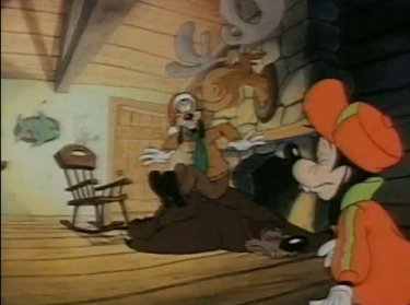 Goofy and Max arrive at their cabin in Asprin. There's a hungry bear around the area, and when he sees Goofy's car approach, he thinks they should have plenty of food with them. Or they'll suffice as the food; whichever. He hides in their living room as the only thing he can disguise himself as, which wasn't a super idea as Goofy immediately sits on him. "Hmm, this rug is kinda lumpy." Goofy pounds the bear, and he doesn't appreciate that very much....