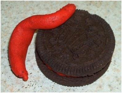 Regardless, the new and otherworldly filling is spectacular stuff. I was able to mold the featureless snake shown above without much creme residue left in my palms, and shit guys, I could never do that with the old Oreos. So many wasted years spent with Oreo guts embedded under my fingernails. So many wasted years.