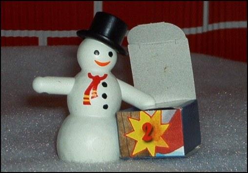 It's December 2nd, and you know what that means. We've gotta pull another gift box from Playmobil's wacky Advent Calendar. Today, a tiny package revealed Mista Snowman's top hat. Wow, the guy's only a day old, and he's already accessorizing? The hat fits over a previously unsightly lump on Mista Snowman's skull, slanted just enough to make him look drunk from eggnog and sloppier than a snowman drenched in dog piss. I think I like him better this way. Course, now that Mista Snowman's ready for the dance, we can only hope than one of the next few gift boxes brings him a new friend. Will it? We'll see. We'll just see about that, Mista Snowman.