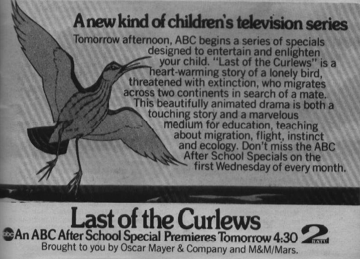 This is the first Afterschool Special, which looks nothing like any of the others. It's an animated cartoon about a bird who flies around looking for a mate, not realizing it is the very last of its species alive. It's clearly aimed at kids rather than teens; even the ad admits as much. It fills none of what an Afterschool Special came to be known for, except for being sad, but I guess that's what counted. Afterschool specials would soon focus on human beans, and completely drown the viewer in divorces, wifebeatings and alcoholism. This bird actually had it easy.