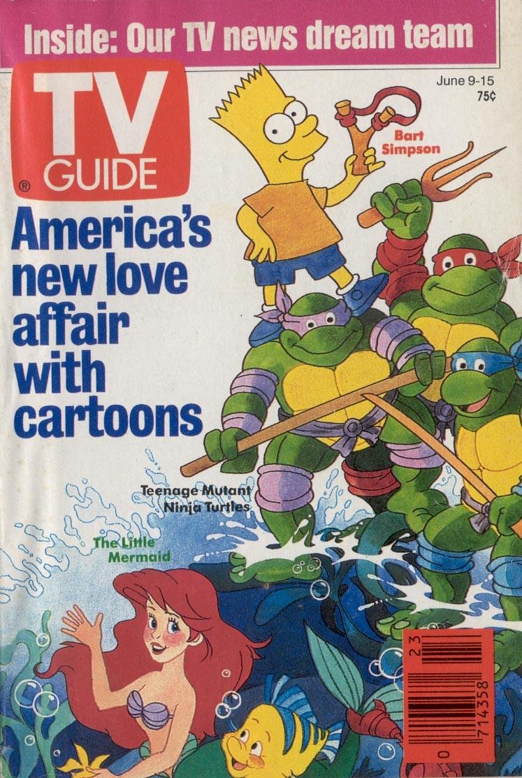 This was the first of several TV Guide covers announcing that cartoons were cool with adults again. Variations on this article appeared again in 1991, 1992, 1993, and all the way until 1997. I was surprised to find a 1990 version, because as this cover suggests, not much in 1990 was intended FOR adults yet, and the 'toons-in-production they talk about inside wouldn't change things either. Captain Planet is mentioned as a show with possible adult appeal, because it was going to have people like Meg Ryan in it and according to the reporter, "the producers hope the campy villains and simple eco-adventures will lure kids, while double-entendres and underlying themes will keep adults tuned in." Where were the "adult themes" in freaking CAPTAIN PLANET??
