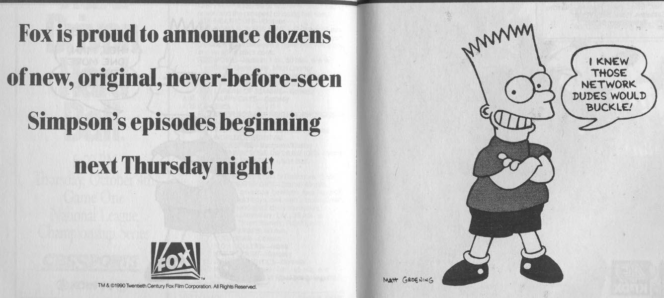 The second new Simpsons episodes debuted, Fox wanted you to KNOW. They took out THREE pages on October 11, despite one of them being completely wasted: