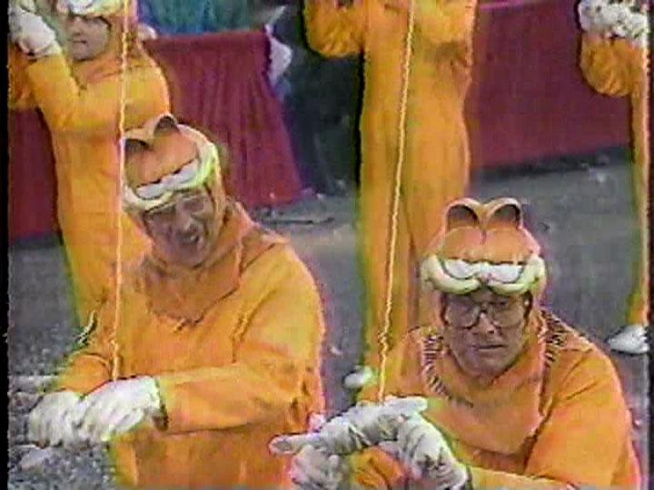 The first balloon of the 1988 Parade was Garfield, and they hyped him up so much that I thought this had to be his first appearance. A little research told me it was not, but Willard was sure into Garfield this year. But hey, who wasn't? It was his tenth anniversary; there were TV specials and tons of merchandise and the world debut of Garfield and Friends. The only people who don't look into Garfield are the miserable guys in these degrading outfits: