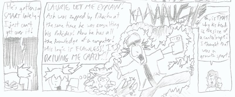 So many years removed, I'm now deeply in #3 with the Pokemon comic. Even though the art is undeniably primitive, I was still impressed by some of the stories I came up with and many of the jokes made me laugh. They are also, unexpectedly, a real time capsule of the late 90s and early 2000s -- they wallow in the culture of the era pretty thoroughly. They're as nostalgic as they are interesting.