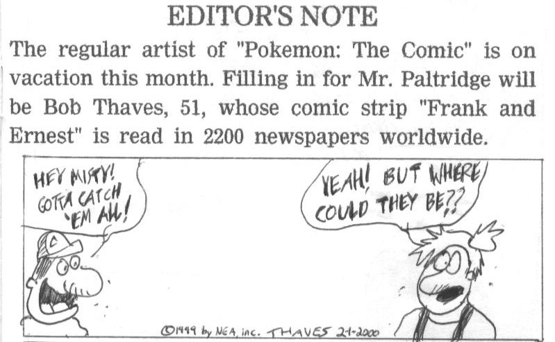If you're not expecting social satire or pop culture references to appear in Pokemon stories, you'd best get used to it. It was the "Wild West" days when the franchise had been in the US less than a year and anything was possible. Halfway through writing it, JFK Jr. crashed his plane and died, and that was the only story the news covered for a solid week. It got into the story because the media's Kennedy worship was really getting on my nerves. There are also several jokes regionally specific to Portland, Oregon in this. Newscasters John Marler and Cathy Marshall appear in this comic because I didn't like them. Also, don't ask me why Ash's hat says "Thomason Subaru."