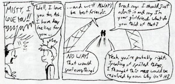 Ash's boss reprimands him for the lousy sales of their cheap games. Ash wonders if it really is his fault and prepares to throw himself into Portland's Willamette River, but is stopped by his guardian angel (this was technically a Christmas issue). He shows Ash an alternate world where he was never born, and Karin is dead (since Ash was the one who suggested they travel to her island), and Misty is alone and friendless. Ash is convinced of his worth now and when Misty catches up with him, he's thrilled to see her. In the final two panels Ash and Misty finally say "I love you" to each other, and then they walk off into the distance. Fade to black.