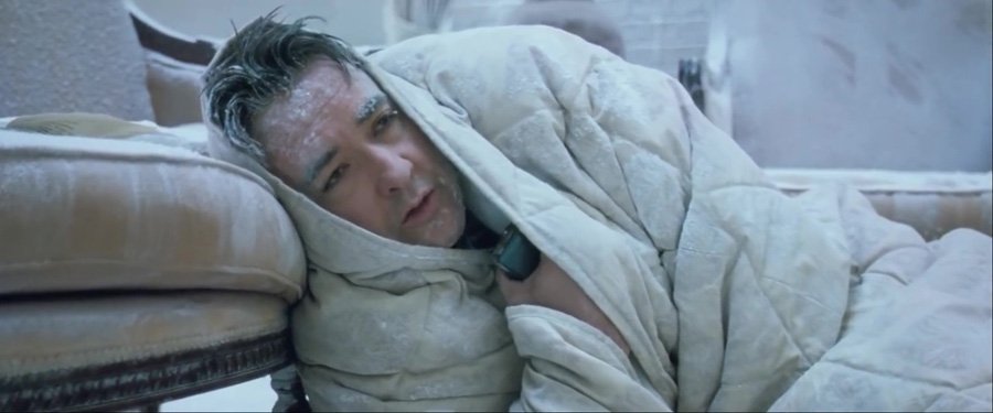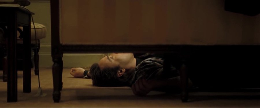 Mike, in the meantime, crawls under the couch to avoid the smoke,