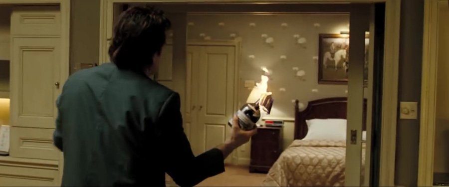 Mike has a different idea. "I've lived the life of a selfish man," he admits, "but I don't have to die as one." If he's going to go, he's going to make sure he takes the room with him. He stuffs some cloth in the cognac bottle, lights it on fire and throws it into the bedroom as a molotov cocktail. The bottle explodes and lights half the room on fire.