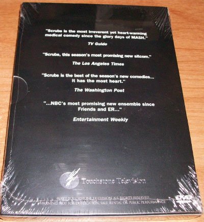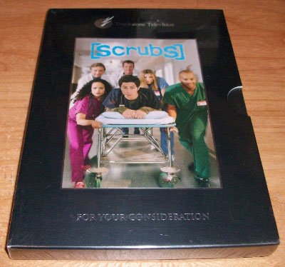This Scrubs box, a 2002 mailing, looks fat enough to hold the entire season -- but it's unopened, again. This is actually better packaging than the retail version got.