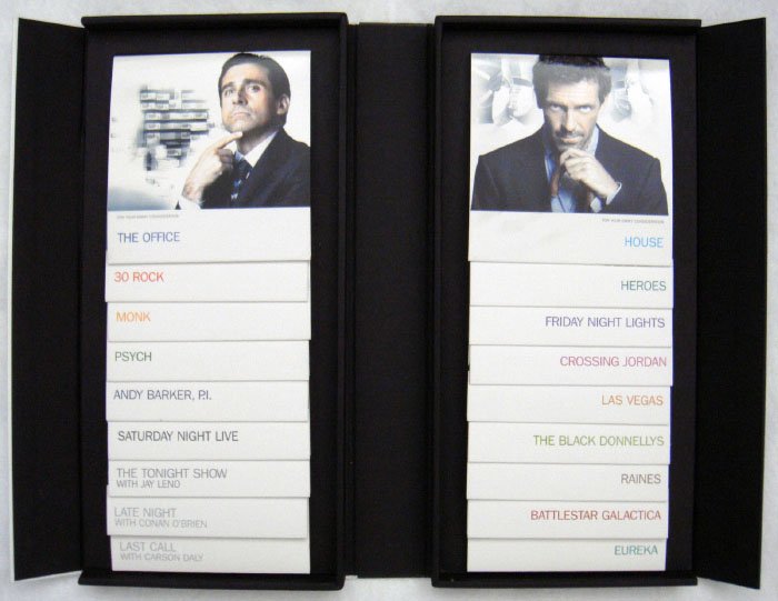This is what NBC Studios sent to the Emmy committee in 2007. A whopping 18 discs were included inside, each with its own individually labeled sleeve. This would cost you a hundred bucks or so at the retailers.
