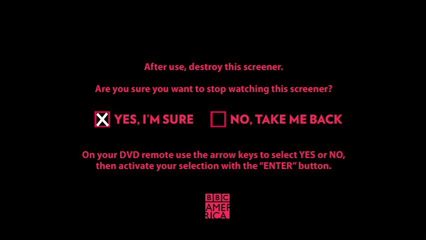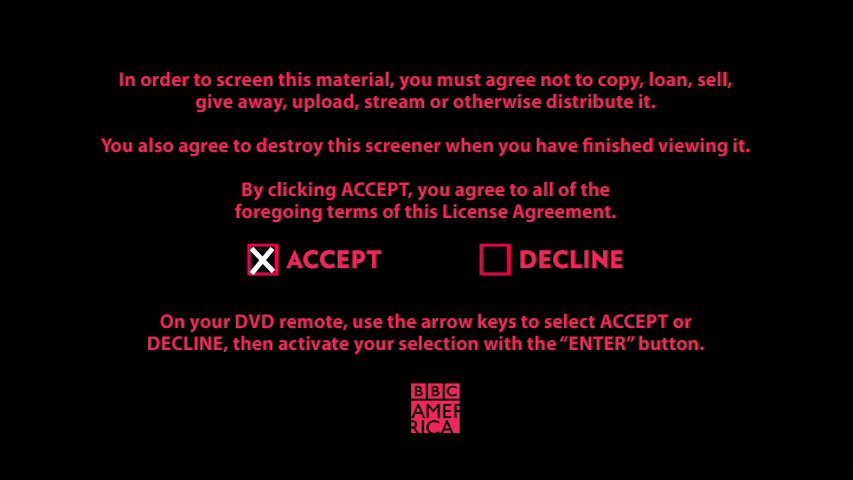 All these companies view the potential piracy issues of an FYC with varying degrees of trepidation. Netflix and Sony don't mark their shows with anything (though Netflix apparently believes a DVD can expire). The ABC Studios discs have an "FYC" bug in the right corner of their shows. But then there's the approach taken by BBC America.
