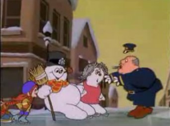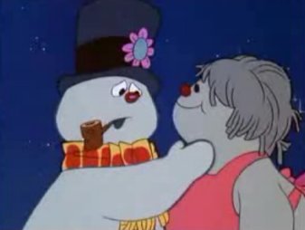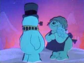 Frosty's so desperate for companionship that he'll take what he can get, and he stays with the inanimate snow woman all evening. He even makes her a bouquet of snow flowers. And then...somehow, when he puts the bouquet in her hands, she springs to life. How'd that happen? Ahh, who cares. Frosty and his new girl, Crystal, take a shine to each other in nanoseconds and happily skip down the hillside. At that moment the cranky Jack Frost shows up, yells "I'LL TEACH YOU FOR BEING MORE POPULAR THAN ME" and blows a strong arctic wind gust that knocks Frosty's hat off, turning him immobile.