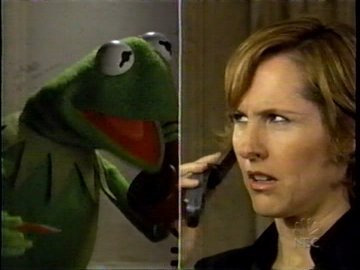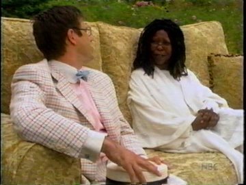Meanwhile, in the cubicles of heaven (wouldn't cubicles be more appropriate for hell?) a nerdy guardian angel watches Kermit's despair on his compy and freaks out. "This can't happen! Someone has to make this right!" he panics. The other guardian angels are apathetic, and tell him if he bothers The Boss without an appointment this early in his career, he'll be out the door before he knows it. Daniel--that's the nerd's name--doesn't care. Some things are more important! This is Kermit the Frog we're talking about! HE'S GOING IN! Daniel instantly finds himself in a big grassy field, and sitting on the couch is the Big One, the Creator of the Universe.....Whoopi Goldberg. Who knew?