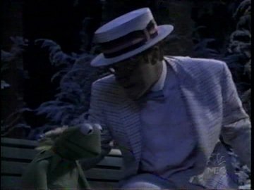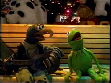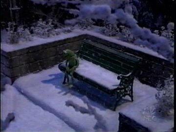Which is why the word "suicide" is never used, nor is there even a bridge. Just as the original opens on George Bailey's darkest hour, here we see Kermit walking through a park depressed and whimpering "it's all over." He then sits on a park bench, where he waits until he freezes solid.