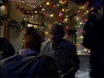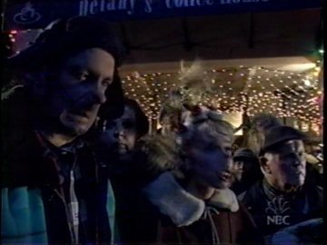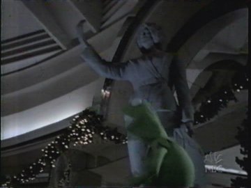 Finally Daniel finds Kermit again, and in a flash of lightning he's back! Kermit immediately apes George Bailey's return to Bedford Falls, going "YIPPEE! WOOHA! YAHOO!" at everything he sees. And when he gets back, he finds....the same old problems. The entire neighborhood has NOT rallied to spare his debts.