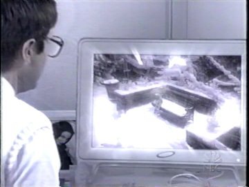 Whoopi grabs a large remote and a framed video screen floats up in front of both of them. "Which one do I push
