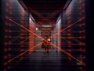When he finally reaches the Bitterman building, it's mere minutes before 6 PM and it's still not over. Ms. Bitterman sees Fozzie on the security cameras and is determined not to let him get to her. She flicks a silent alarm and about a thousand lasers appear, frying Fozzie. Then Fozzie finds he left the money bag at the end of the hallway and has to go through the lasers two more times.