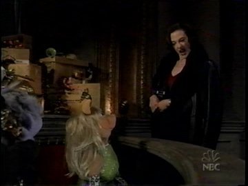 In enters Pepe the Prawn, a character that may be unfamiliar to those who quit paying attention to the Muppets by 1998, the year Muppets in Space came out. Pepe is best described as "what if Glen Quagmire was a talking shrimp in a suit." He's always been uncomfortably off-color compared to his surroundings, and this time's no exception: he makes a crack about a topless bar that feels very out-of-place for a Muppet special. The new act is a disaster, and to make matters worse, the star of the night's show (Miss Piggy) is abruptly leaving without prior notice, as she just landed a gig in Hollywood. And to make matters even more worser than worse, the man who provided the Muppets the loan to open the Muppet Theater, Mr. Bitterman, has died. The contract stated the latest payment of their loan was due that night at midnight, but Kermit had worked a deal with the good-natured Mr. Bitterman to allow payment to be delayed until the following week, when all the receipts from the Christmas show would be in. That sort of thing doesn't wash with the woman who has inherited and now controls Bitterman Bank and Loan. It's the Muppets' most fearsome villain ever: