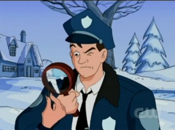 The next morning Grandma still hasn't returned home, and everyone actually starts to worry. The police are called, and Jake is still swearing it was Santa who hit her, but he's again told Santa doesn't exist. Jake leads everybody to the scene of the collision, where they all see a big snow imprint shaped like an old lady, crossed by sleigh tracks. "Anybody could have made that shape on their own," the cops say. Darn, will there be no justice? Hold the phone! One of the cops finds a hair on the ground and examines it closely. After five seconds of scrutiny, he comes to one infallible conclusion: it's a reindeer hair, and not just any reindeer hair, but the kind of hair that FLYING reindeer have! "But that's just a guess," the cop ends with. Guess or not, no one questions Jake anymore. That hair proves the existence of Santa! Wow, that was quick.