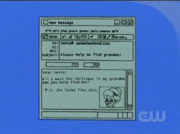 Grandpa doesn't realize Mel tricked him until it's too late. The only way to stop the sale now is if Grandma is found, and they have one week before the deal closes! Grandpa suggests that if Santa hit her, then Santa might know where she is. "But how can I possibly contact Santa??" Jake explodes. "Oh, wait. I think he has an E-mail address!" Argh, it's been that simple the entire time? Why didn't he think of it earlier? Probably because he wasn't used to having that convenience. At the time this was made, electronic mails were still a new thing. If Winnie the Pooh had E-mail in 1990, his entire special might have never happened.