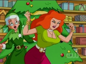 Mel and her malicious lawyer are walking down the street when they spy Santa's sleigh in the sky, and Grandma inside. Jake and Santa race inside to stop the sale and leave Grandma unattended. Mel's lawyer sneaks over and claims she's a friend who came to get her. Knowing nobody, Grandma falls for it and leaves. Are there two Mels? How could she be in the closing meeting right now if she's also on the street kidnapping Grandma? Who can guess, but just as Mel is about to close the deal with Bux, Jake arrives screaming "STOOOP!" Jake swears he's found Grandma and she's right outside -- which, unfortunately, she no longer is. Santa Claus is a good enough substitute, though, and he proves his identity by telling Bux exactly what he wanted for Christmas at age five. The word of Santa is good enough for Bux, so he stops the sale just in time. Santa explains the whole story -- that he accidentally hit Grandma with the sleigh and all. Mel is one steamed bimbo, until she hears what's happened. She's found a new straw to grasp. "If you hit her with your sleigh, and she is nowhere to be found, you're responsible for her disappearance and that is grounds for YOUR ARREST!" Mel spits. "NOOOOOOOOOOOOOOO!!!" Jake Darth Vaders.