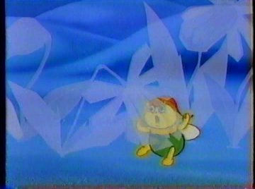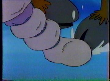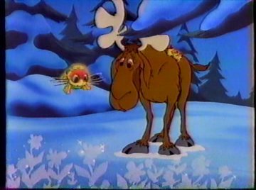 Oh yeah....the Glo-Worms got out of that thing they were in. The flying Glo-Worm arrives with some interesting news: he saw a flying MOOSE up there. Some Glo-Friends scoff at the idea, but others believe in any possibility. The team splits up: half continue onward to Santa, while the other half looks for the moose. It's that moose, all right, but this time it isn't of his own free will. Blanche got so fed up with him that she enchanted his antlers and sent him into a dizzy floating flight pattern across the area. Eventually, he gets stuck in a tree. While they try to free him, the other Glo-Friends run afoul of a crop of carnivorous ice flowers. Blanche has been here!
