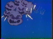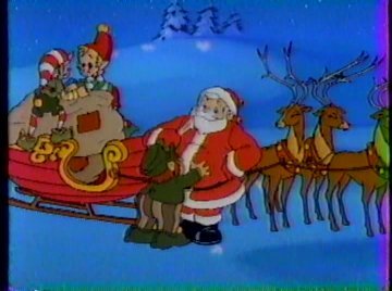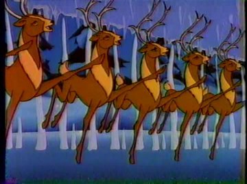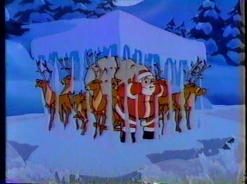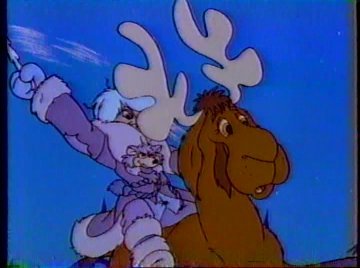 Meanwhile, not very far away, Santa Claus is rounding up his reindeer for his yearly trip. I didn't know Glo-Worms lived at the North Pole. Maybe they've just been put there for the sake of convenience. It could have come back to bite them if the Glo-Worms had landed their own series after this. Meanwhile, not very far away from Santa Claus, the WICKED WITCH OF THE NORTH POLE scowls in anger and jealousy at Santa's popularity. With her is a flying moose with Lorenzo Music's voice that was rejected from Santa's reindeer lineup because, well, it was a moose and not a reindeer. He needed to be someone's sidekick, and the Wicked Witch was the only other option. "That glory-hogging Santa Claus