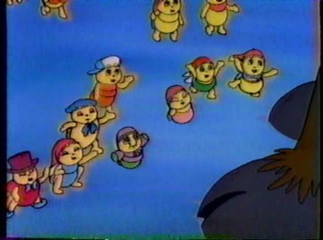 How will the Glo-Worms resolve this mess? The special is resolved the same way the movie Stardust is resolved....defeating an evil witch by glowing. Now that the gang's all here, they join hands in a circle around Santa's ice cage and start shining. Oh no, just do it, don't sing about it! "Gloooow, let's gloooooow..." they annoyingly repeat. When they started doing this, I thought of the fact that everyone is standing ON ice, and that this might not be the best plan to go forward with. But oddly, only the ice cage melts. The ice floe Blanche is standing on DOES melt, despite being nowhere near the Heat Zone. And after she falls into the ice-cold river, her wand melts too (who cares about physics, it's not like this is going to be discussed by adults 25 years later).