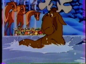 Moose gets in position, snorts a couple times, and charges toward Blanche! What will she do? If only she had a wand that could do anything! But Blanche doesn't use the wand. She just sticks her foot out and the moose trips and falls behind her. When you challenge an evil witch and she defeats you with her FOOT, that's really pathetic. It looks like the materalistic aspects of Christmas are doomed!