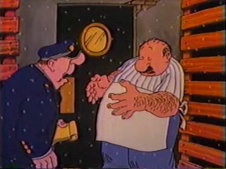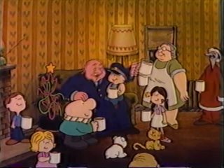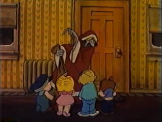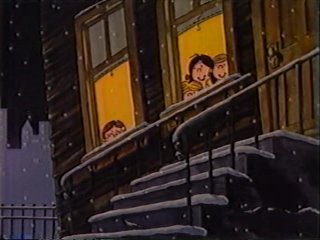 Right at the second when things are about to get REALLY ugly, they hear giggling and freeze in place. A foster home full of orphans are watching them from a nearby window. Uhh......they're really here to.....SING CAROLS! "SOOY-LENT NOIIIIGHT!" the policeman starts, sheepishly, and the other two join in. If you listen closely, you can finally find out what Ziggy sounds like. Sorta like Droopy. The caretaker opens the door. "Ah, that was beautiful! Please come in! We would love to have you visit with us."