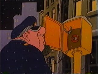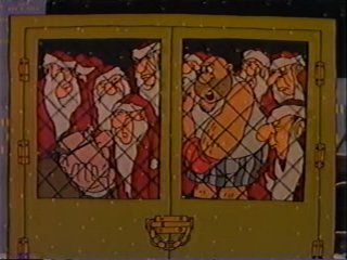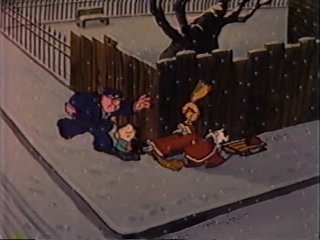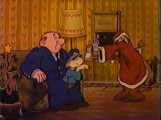 I have to admit....I've never understood the whole deal about cartoon policemen sounding like leprechauns. Where did that come from? Why should a cop be expected to have an Irish accent if the setting is clearly America? Brogueish Policeman #4,353,467,923,458 is on the case of the bogus Santas, many of which are getting busted as accomplices despite being clueless to the whole scheme. This isn't good for Ziggy, who he's increasingly suspicious of. Fortunately, in Ziggy's case, the money never really gets to the criminal mastermind....Ziggy keeps seeing things that he has to give money toward, and eliminates the middleman by giving them cash from the pot directly. There is one pointless moment when Ziggy meets another Santa and takes money from his pot to put into that guy's pot. You're missing the point, Ziggy.