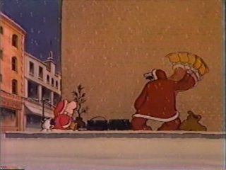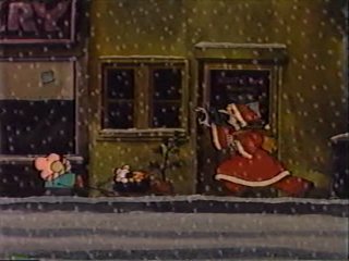 "Ahhh yeees, you must be here for the Santa Position!" Ziggy is hired instantly, despite his being much too small to fit into the Santa costume. His application is "filed" in the wastebasket and the man tells a bare empty room "the position has been filled." He shuts the door and says to Ziggy, "Oooh, they took it rather badly!" He's not the only shifty character in this cartoon. There's also a thief who bares more than a little resemblance to the title thief of Richard Williams's movie. He's mute, has a big pointy nose, and moves slowly and cautiously. He may be purplish, but it's the same guy, fundamentally.