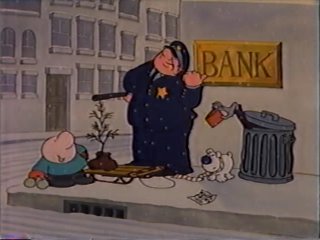 The children believe the stringy purple thief is Santa Claus, and start swarming him for the "presents" in his bag. The thief swallows hard -- he can't do this anymore. He starts handing out his purloined property to the orphans, and even has a gift for the officer....his own police badge. He gave that one rather nervously. Ziggy brought his own present...the stray cat. The kids love the cat and it seems to feel at home already, so...why not?