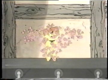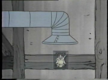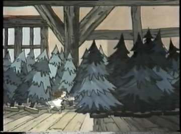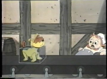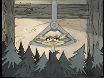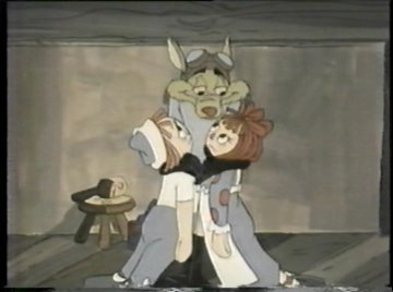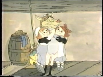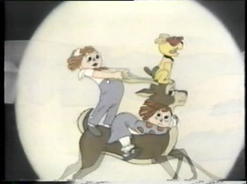 Tonight you get not only Raggedy-Ann and Raggedy-Andy, but a brand NEW Raggedy-Doll, available just in time for the holidays! It's their faithful mutt Raggedy-Arthur, sure to become a beloved classic! ....Or not. Both Comet and Ann are voiced by June Foray, so she talks to herself for much of this scene. Comet crashes through the second floor window of the dolls' home and at first they take her to be some kind of horned monster, but she calms them down. Once she explains the situation, they agree to help, despite knowing very little. "Gloopstik? That's horrible!" says Ann...and Comet didn't even explain what it was. Nobody watching knows what Gloopstik is. They'll get around to explaining it eventually, right? "Let's hurry," Comet says as the dolls climb onto her back. "We have to stop the Wolf before it's too late!"