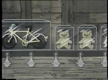 While that's going on, Comet explains to the dolls that Alexander Graham Wolf isn't just any talking genius wolf....he's the Big Bad Wolf! THE Big Bad Wolf! Blowing down homes and eating old ladies is one thing, but now he's LAMINATING BICYCLES! He's gone TOO FAR! I never would have guessed he was that one. I suppose this isn't the freakiest thing the Wolf will ever do, but it's high on the list.