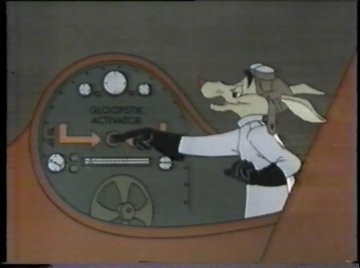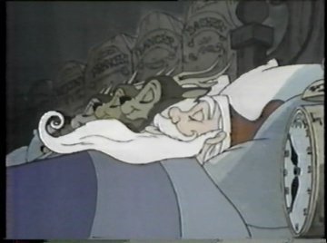 Comet and the dolls are shocked to find out how much progress Mr. Wolf has already made, and they beat a path down to the workshop. The Wolf, a bad judge of hostility, greets them with open arms. "I want you both to see the GREAT THINGS I've been doing for children everywhere!" The Wolf explains just what's been going on in his head all this time. What happens to Christmas presents after kids get them? Kids throw them around and wreck them, or they wear out themselves, or break. Imagine if you could get a Christmas present that would last FOREVER, because it was encased in solid Gloopstik? That'd be much better, right? Obviously, there's a flaw in this logic. Ann points out that there's no point in getting something if you can't even use it. The Wolf says it doesn't matter anyway because he holds the patent on Gloopstik, which means Santa will have to pay him MILLIONS for the rights to distribute the toys! That sounds more like a villain's scheme...so why didn't Chuck Jones start with that? Up to this point Wolf hasn't seemed worthy of the prefix Big Bad...just a misguided zealot. More like PETA than the Grinch.