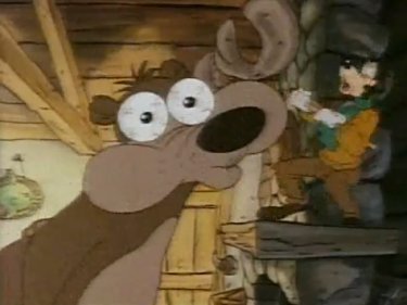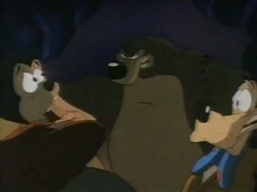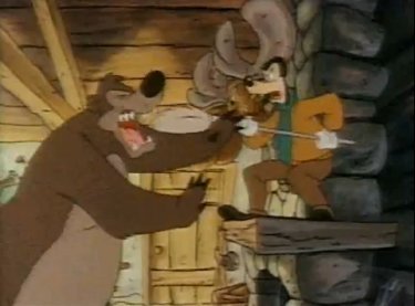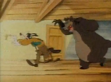 Goofy and Max arrive at their cabin in Asprin. There's a hungry bear around the area, and when he sees Goofy's car approach, he thinks they should have plenty of food with them. Or they'll suffice as the food; whichever. He hides in their living room as the only thing he can disguise himself as, which wasn't a super idea as Goofy immediately sits on him. "Hmm, this rug is kinda lumpy." Goofy pounds the bear, and he doesn't appreciate that very much....