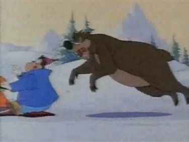 Everybody except Pete goes sledding together. Pete's instincts were correct -- he really wouldn't have liked this trip, which consists of several dozen physical gags that don't lend themselves to a written review very well. Through a series of mishaps they get the bear involved, and he tries to eat them again, but winds up taking a plummet off a cliff. Goofy and company go off