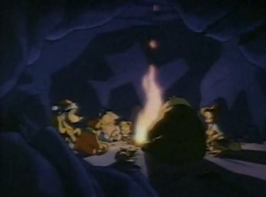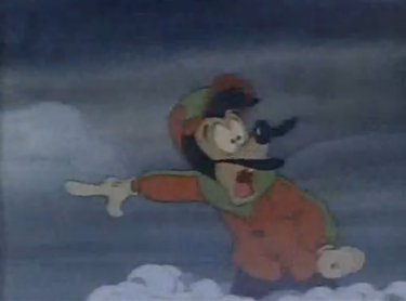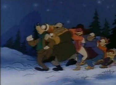 The blizzard outside is getting so thick, Goofy steps right off a cliff (there seem to be a ton of them in Asprin). Elsewhere, the family is searching and Max hears Goofy's trademark "YAAAAA-hoohohooeyyyy" in the distance. "THIS WAY!" he points. The gang discovers Goofy upside-down in the snow, with only his shoes and socks sticking out. They dig him out, drag themselves to a cave, and warm up by a makeshift fire. "Are you okay,