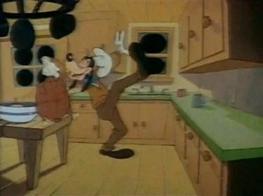 It might happen, but not to Pete. As Goofy is preparing the feast, he leaves the door open, and the bear enters. And THIS time, he's not taking any more punishment! Goofy continually just misses seeing him, and inadvertently hits him over and over. That just makes him angrier. Pete enters the kitchen to explore what all the noise is about. He freaks out and drags Goofy out of there.