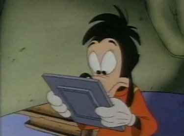 "It's....gettin' kinda....stuffy in here......think I'll go get some fresh air...." Goofy says quietly. He pulls on his Santa hat, pulls on the cat (which he thinks is his coat) and exists sorrowfully. Pete is instantly cheered up now that Goofy's outta there. "What say we all open our presents, HMM?" Pistol got a horned barbarian hat. "Woooo, I'm Conan's girlfriend!" she shouts. I think O'Brien has a little classier taste than that. Max opens his present, the one Goofy rescued, and....it's a photo of him with his dad. It's too much for him to take. He has to head out into the snow after him. And so does everybody else -- especially Pete, or there'll be no lovin' from Peg.