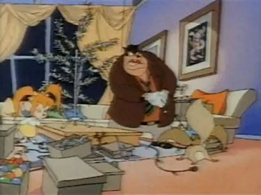 misfit? Beginning in 1990 with TaleSpin, Disney started including seasonal episodes as part of their 65-episode orders for The Disney Afternoon. They stopped with Bonkers, so only four were made...and "Have Yourself a Goofy Little Christmas," the Goof Troop edition, was the only one broadcast in prime-time, as "A Goof Troop Christmas." It was expanded to an hour by adding two vintage Disney Christmas shorts and a behind-the-scenes look at the movie "Aladdin." Bop-bop-a-loo-bop! Yeeeah. Here's something to think about tonight. Have you ever wondered what animals Goofy and Pete are supposed to be? The answer is, Goofy is a dog (original name: "Dippy Dawg") and Pete is a cat who got his start chasing Mickey, though never to eat him. Pete's wife Peg looks more like a dog, therefore Pistol and PJ have to be...blasphemous cat-dog hybrid cogs. If that wasn't surprising enough, look at their pets. Goofy owns a cat and Pete owns a dog. They own each other's species as property! No wonder they can't stand each other.