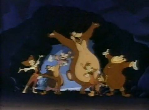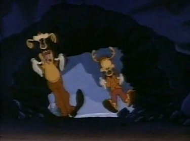 AAAH! It figures this is HIS cave. Well, he invaded their homes...turnabout is fair play, right? ....Try explaining that to him. The ursine nightmare has them cornered! "NOOO! I'M TOO HANDSOME TO DIE!!" Pete shrieks. He lifts Goofy up and yells, "TAKE HIM!!" Suddenly, Goofy and Max get an idea. Remember the Reindeer Dance? Turns out it was important to the plot. The Goofs' nonsensical soft-shoeing distracts the bear from chomping off Pete's head. Then everybody starts joining in, even the bear! It's weird, but it works. They're all friends now, thanks to the power of the Reindeer Rhumba!